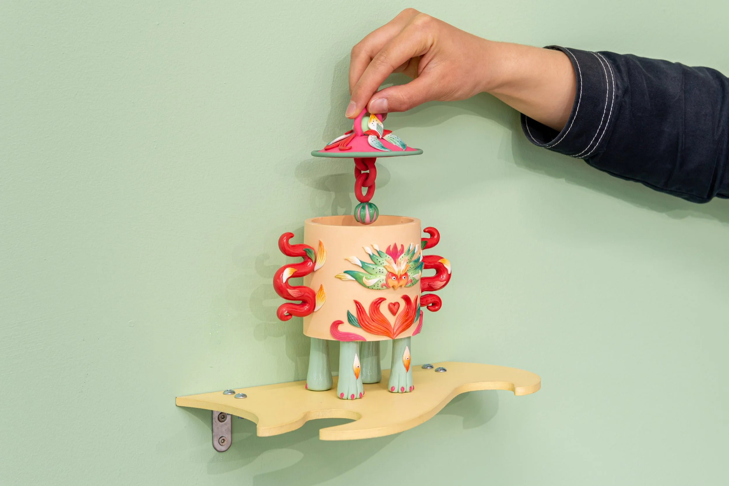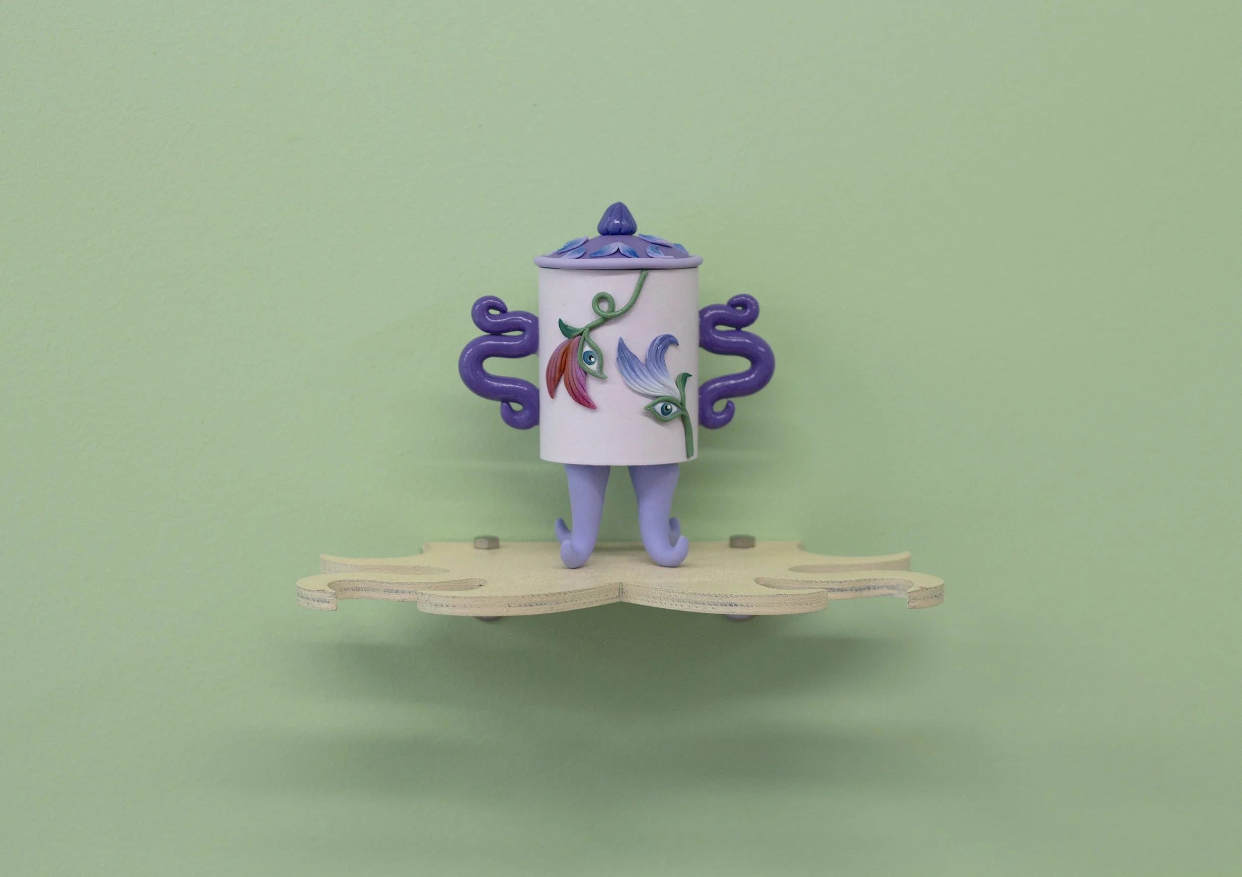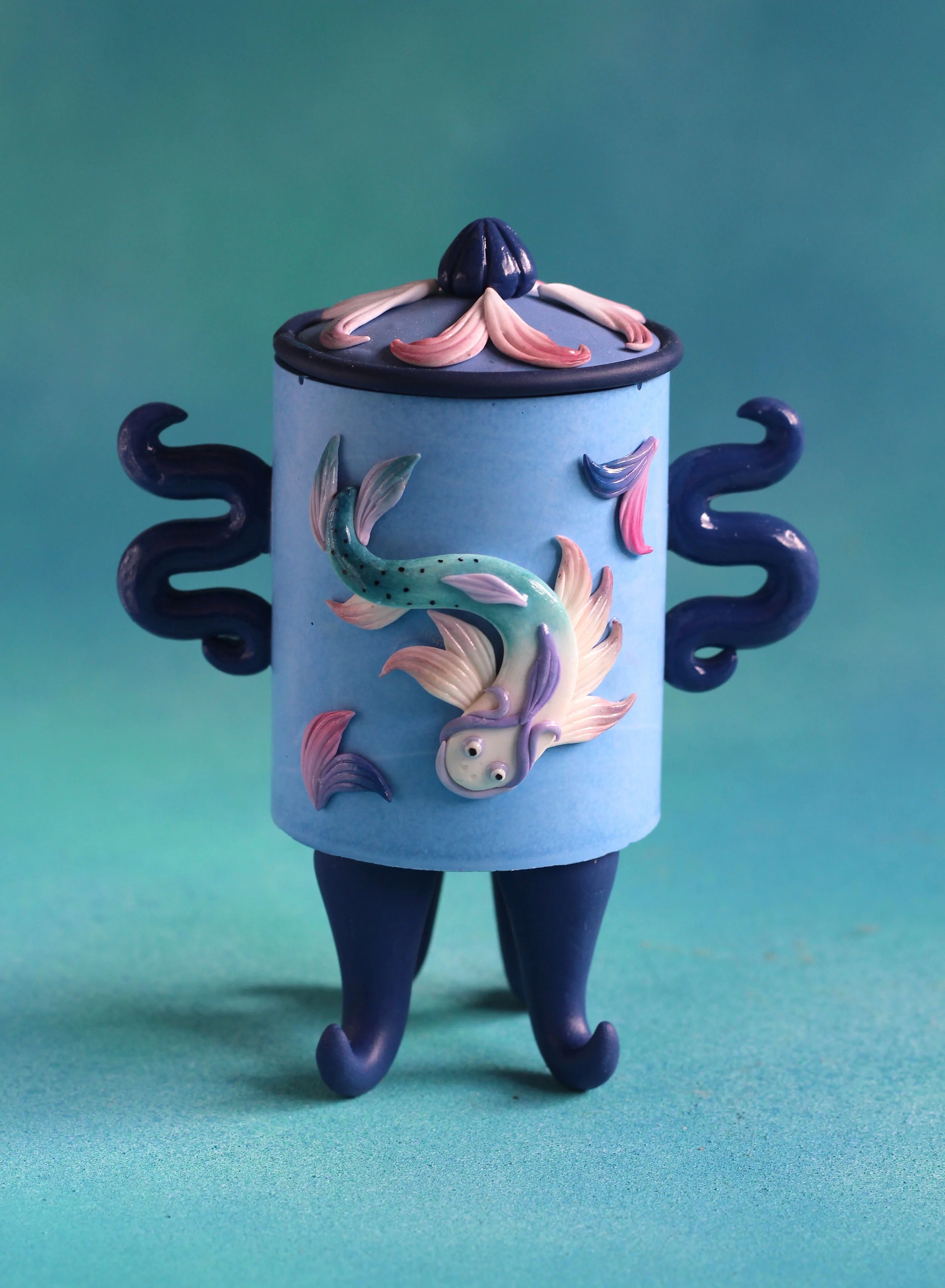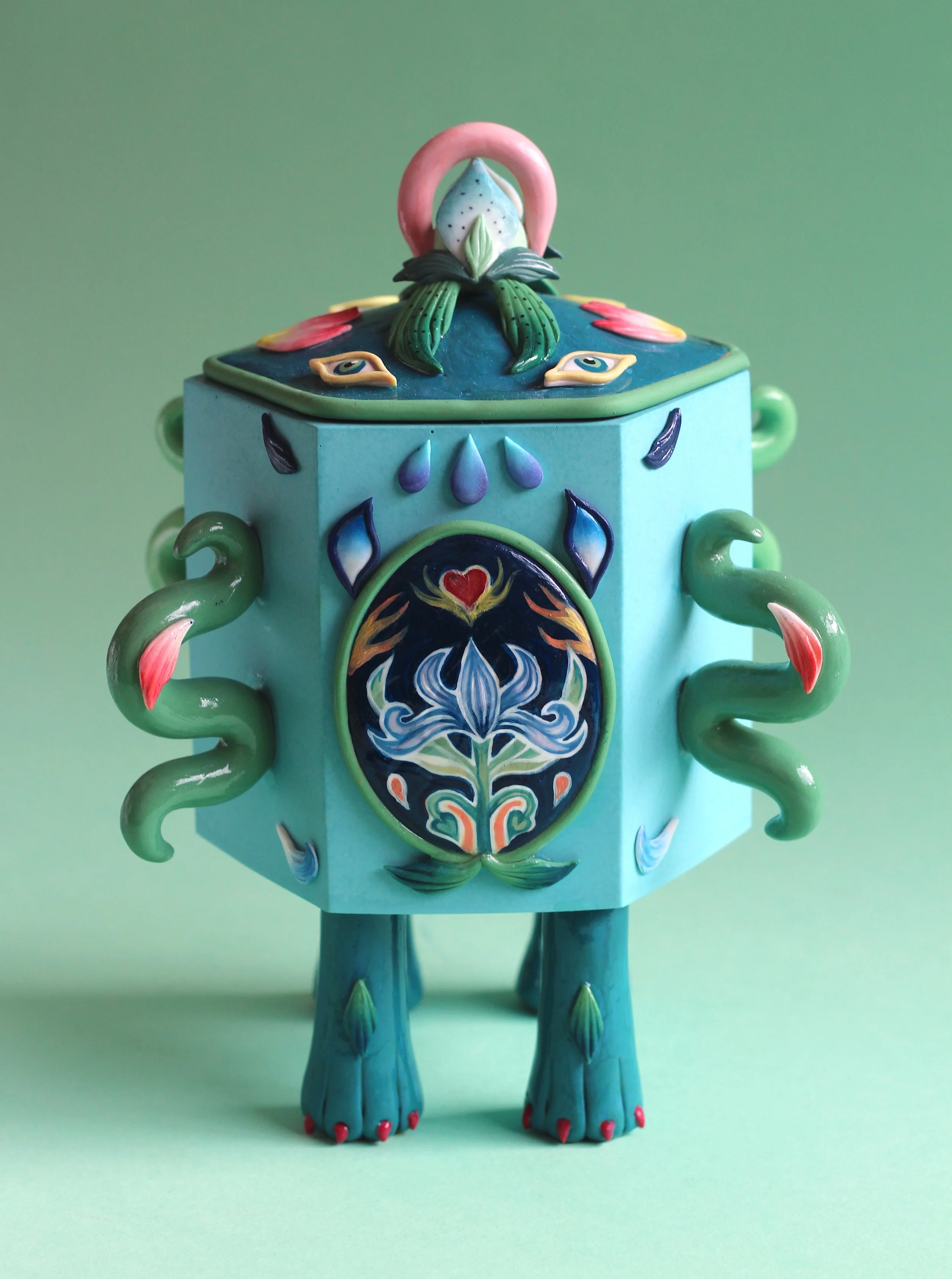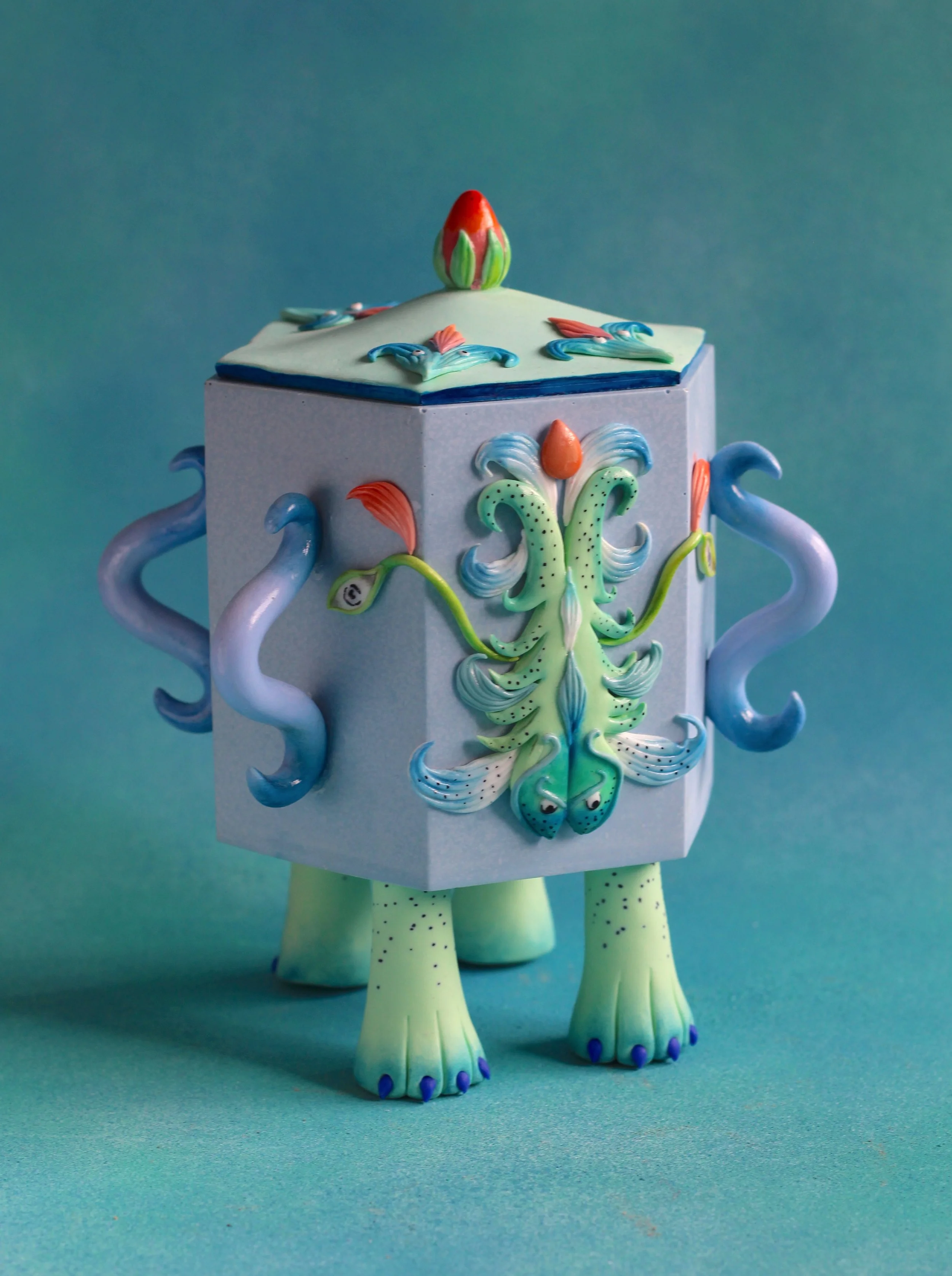 This particular interest in ornament has shaped and remained present in more recent elements of my practice. Captivated by the ornate and intricate snuff bottles that I would often find in the East Asian sections of many British Museums, I started to create my own versions. My snuff bottle-like works are far larger than the traditional designs, often anthropomorphised with arms and legs, and most notably, they don’t contain snuff. Initially, these works were inspired by objects that were emblems of my heritage, more recently they’ve come to reflect my research into a series of Classical Chinese texts, including ‘The Classics of Mountains and Seas’; an ancient Chinese mythological-geographical anthology and Pu Songling’s ‘Tales of a Chinese Studio’. I’ve been using the enchanted objects, creatures and landscapes within these texts as inspiration for my most recent series of snuff bottles, further merging elements from Medieval bestiaries and mythology to form my own process of sculptural storytelling.