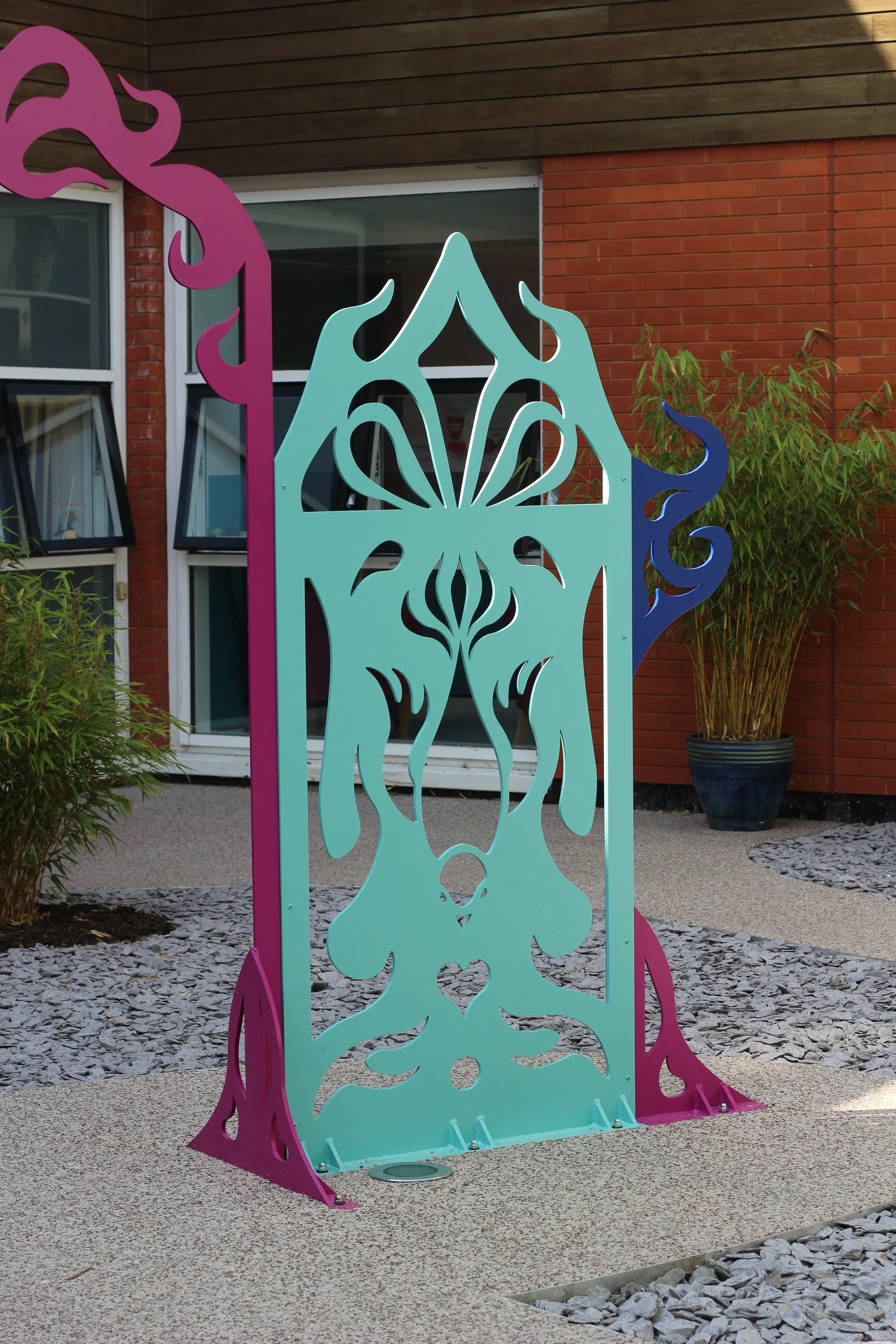 I’ve always had a strong interest in folding screens, altarpieces and shrines. All three often feature imagery that evoke a sense of peace, tranquility, solace and hope. Traditional Chinese folding screens are often decorated with sweeping mountainous landscapes or beautiful plants and birds, whilst altarpieces and shrines are adorned with symbols and images that relate to love and reflection. I wanted the work to encapsulate an element of all of these things through the depiction of a selection of symbols, that have their own distinctive meanings but also appear often throughout parts of my work. These symbols have been laser cut into the surface of the metal ‘doors’, which are then painted in an array of soft but vibrant tones.